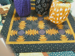 This was a free pattern at Quilters Haven (in Bountiful, Utah) and they didn't have a picture with the pattern so I had to take a picture on my phone, its an orange, purple and black foundation paper pieced tabletopper, I also received a free pattern for a Pumpkin Parade Pin Keeper, and several pumpkin tablerunners and tabletoppers.